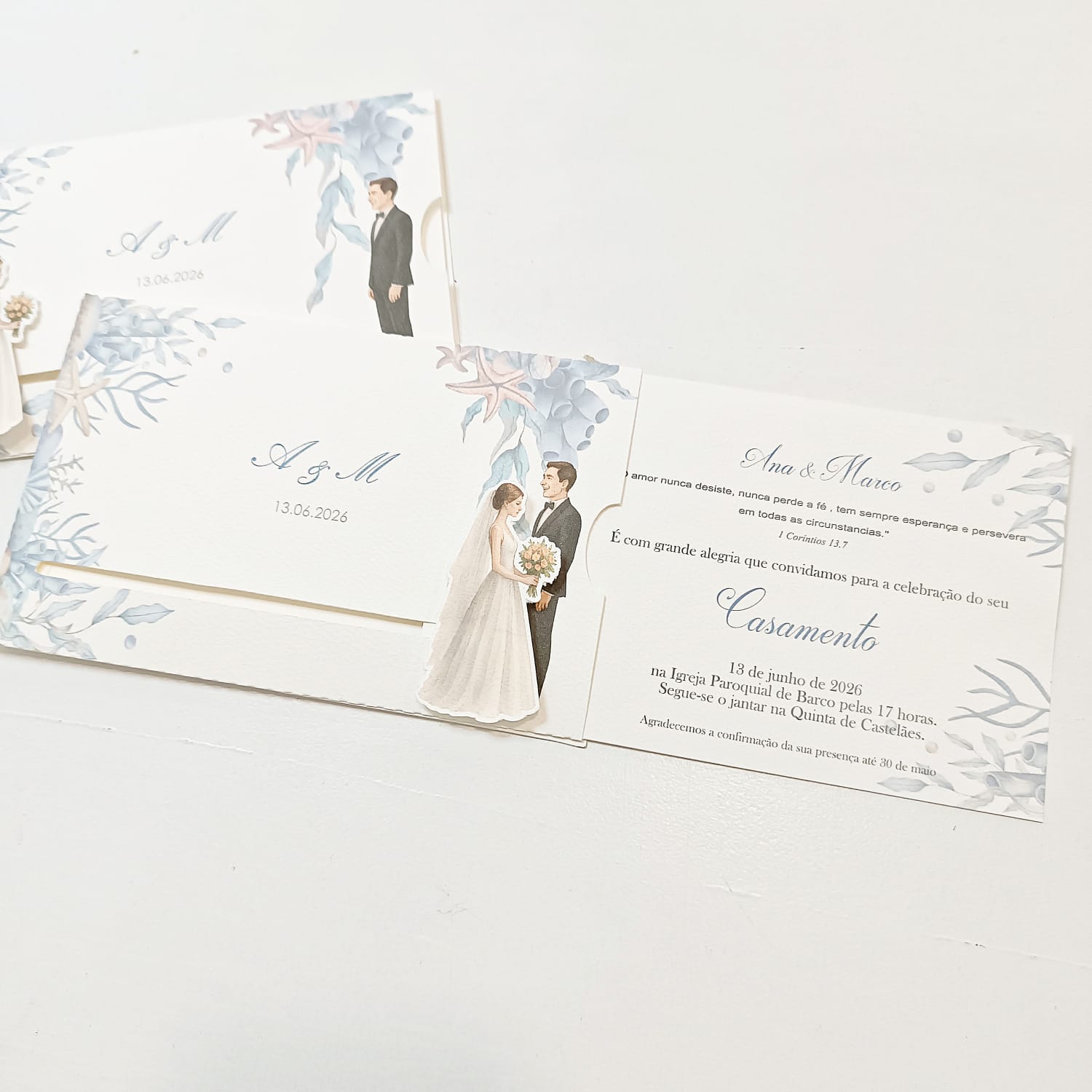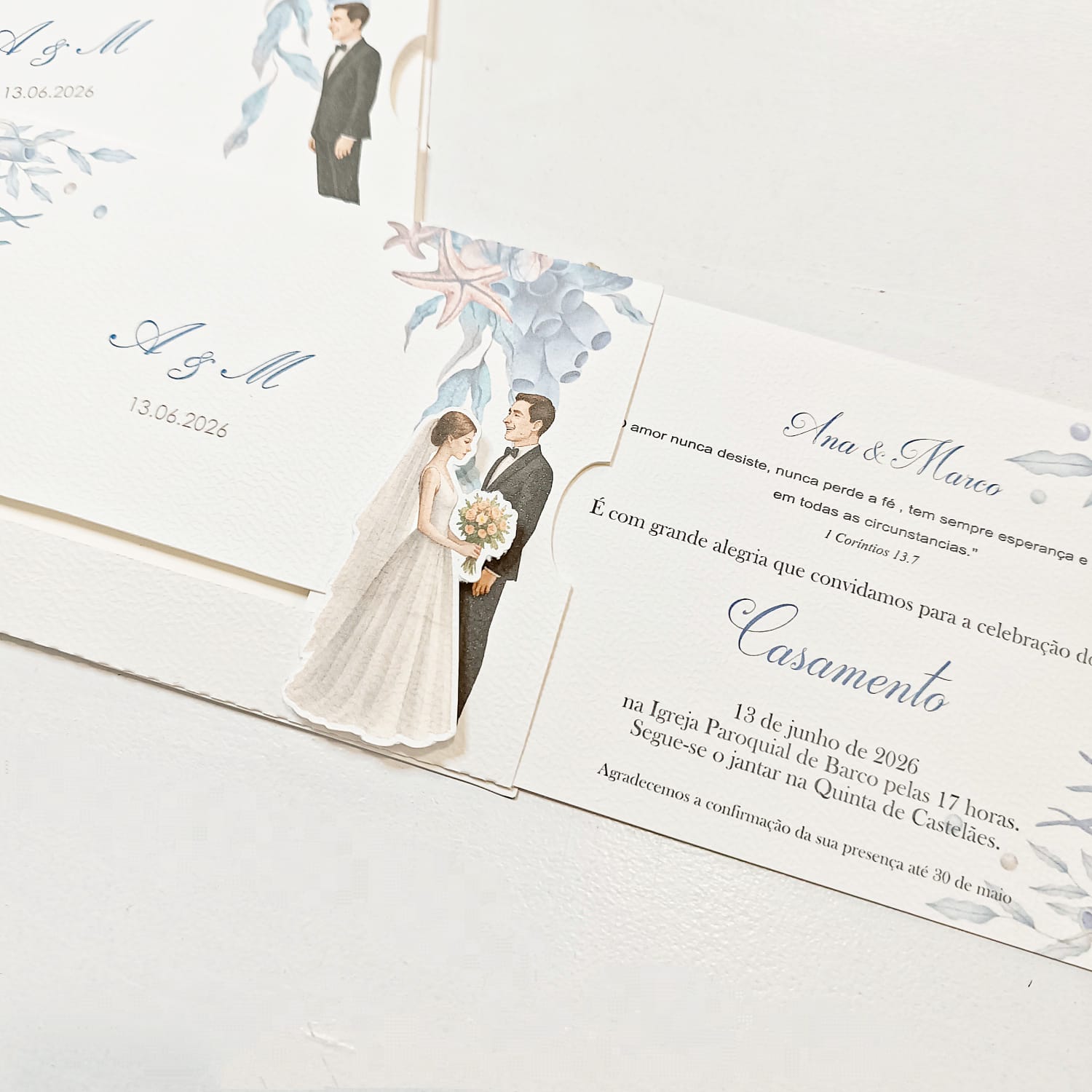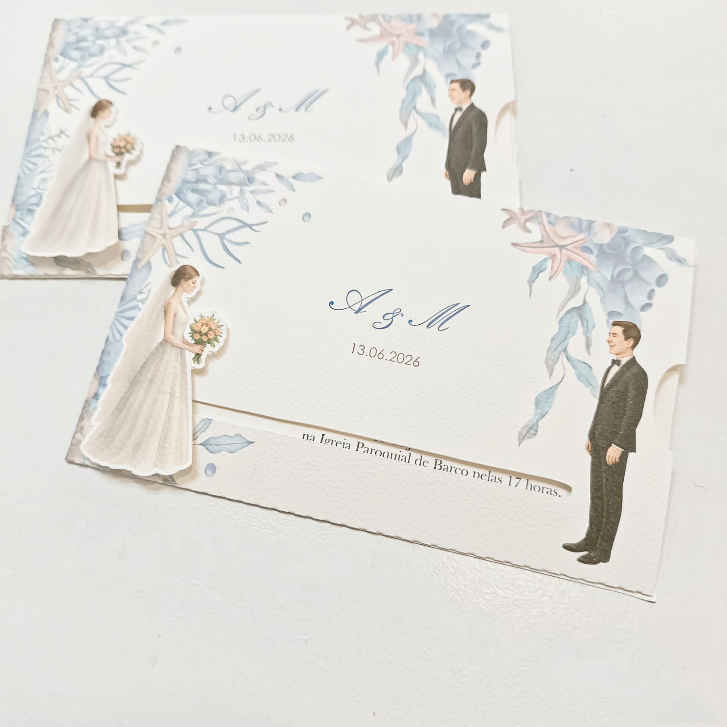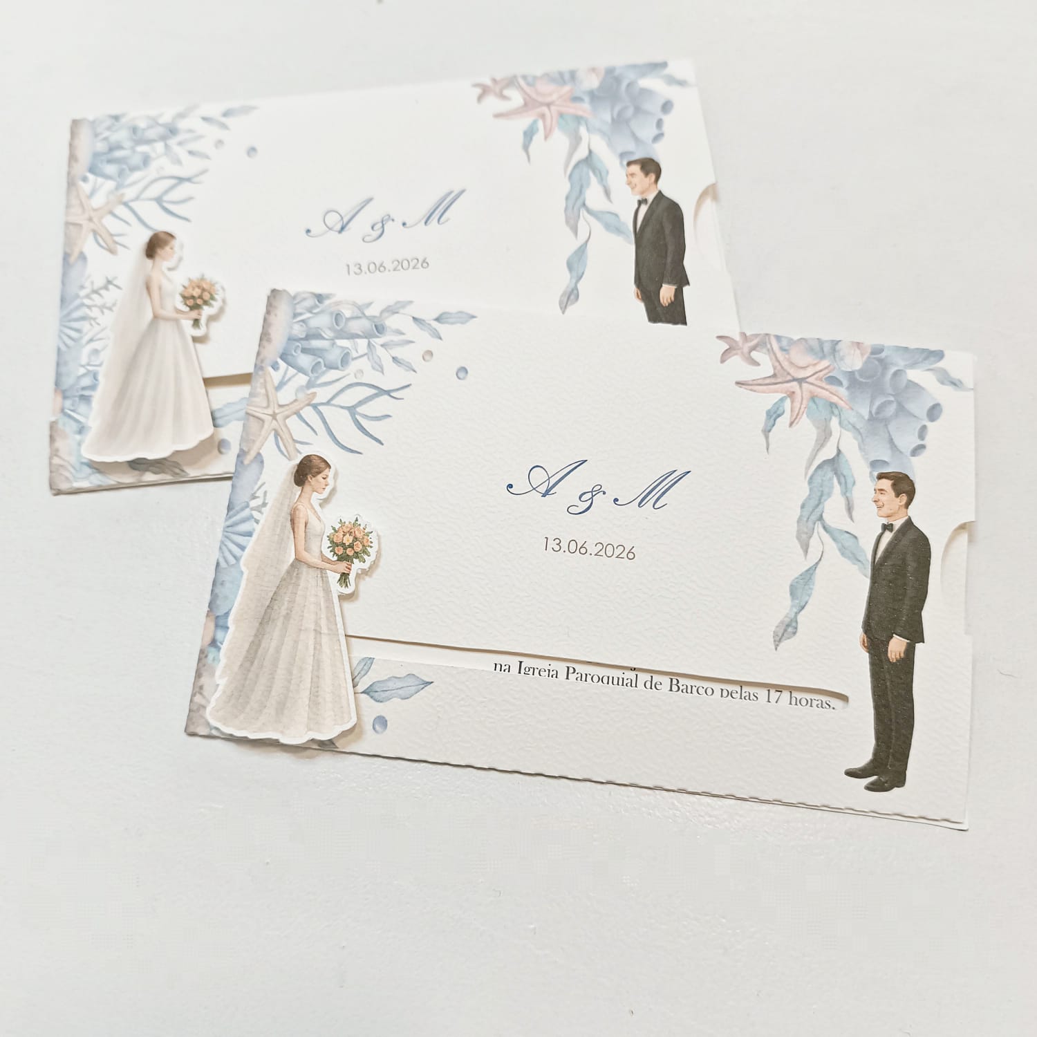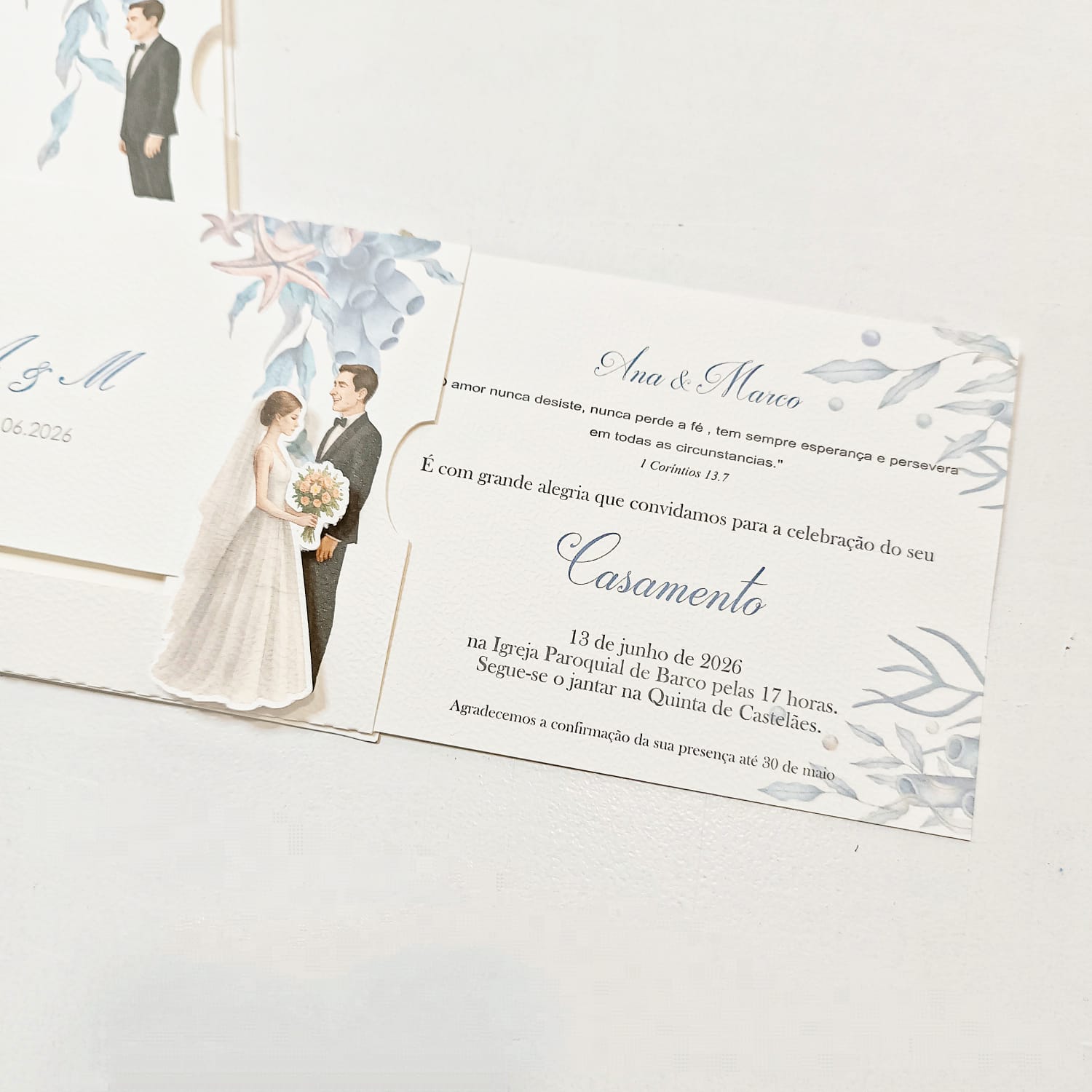 Um convite que conta a vossa história através da arte! Este modelo destaca-se pelas ilustrações delicadas e personalizadas do casal, criando uma peça única, emocional e absolutamente inesquecível.