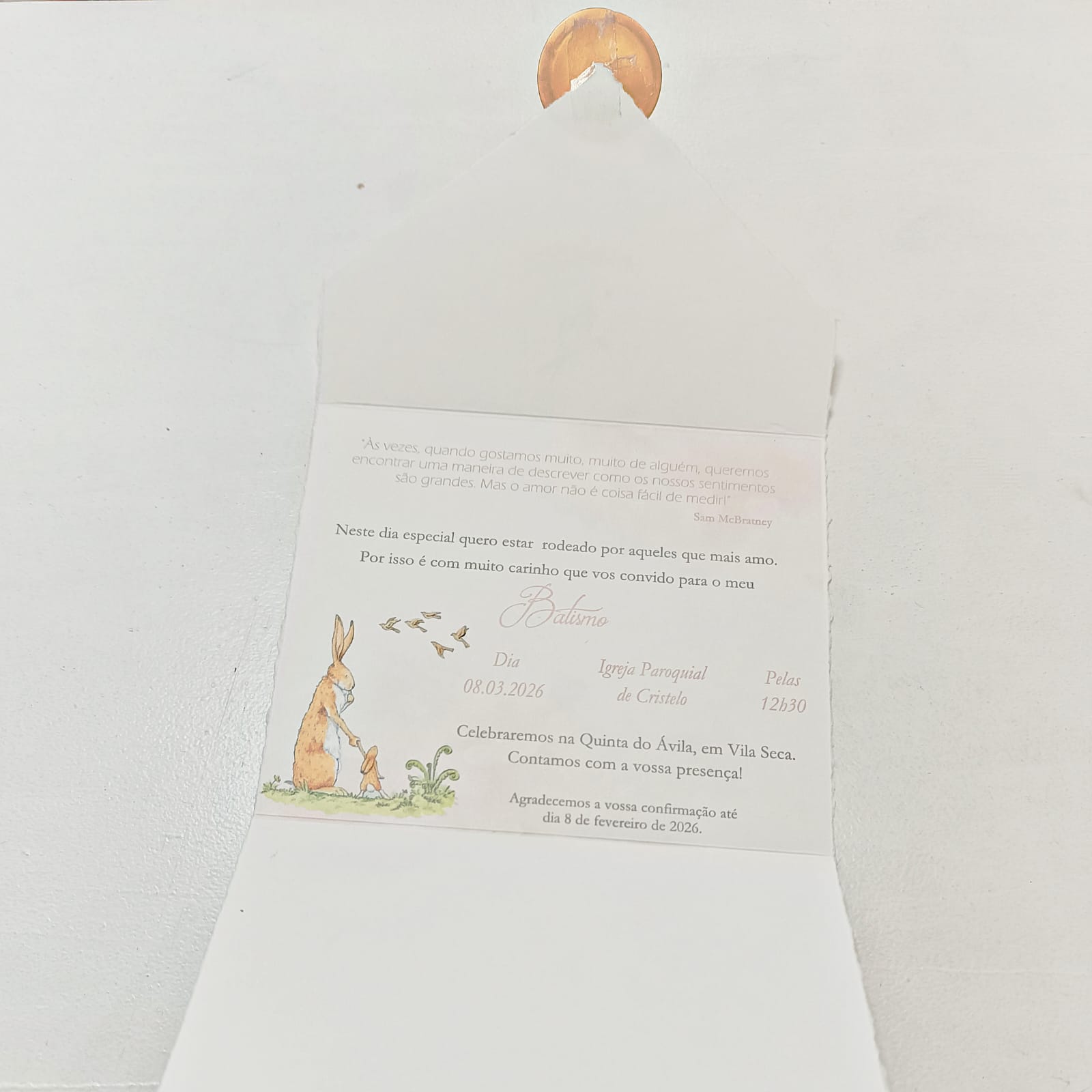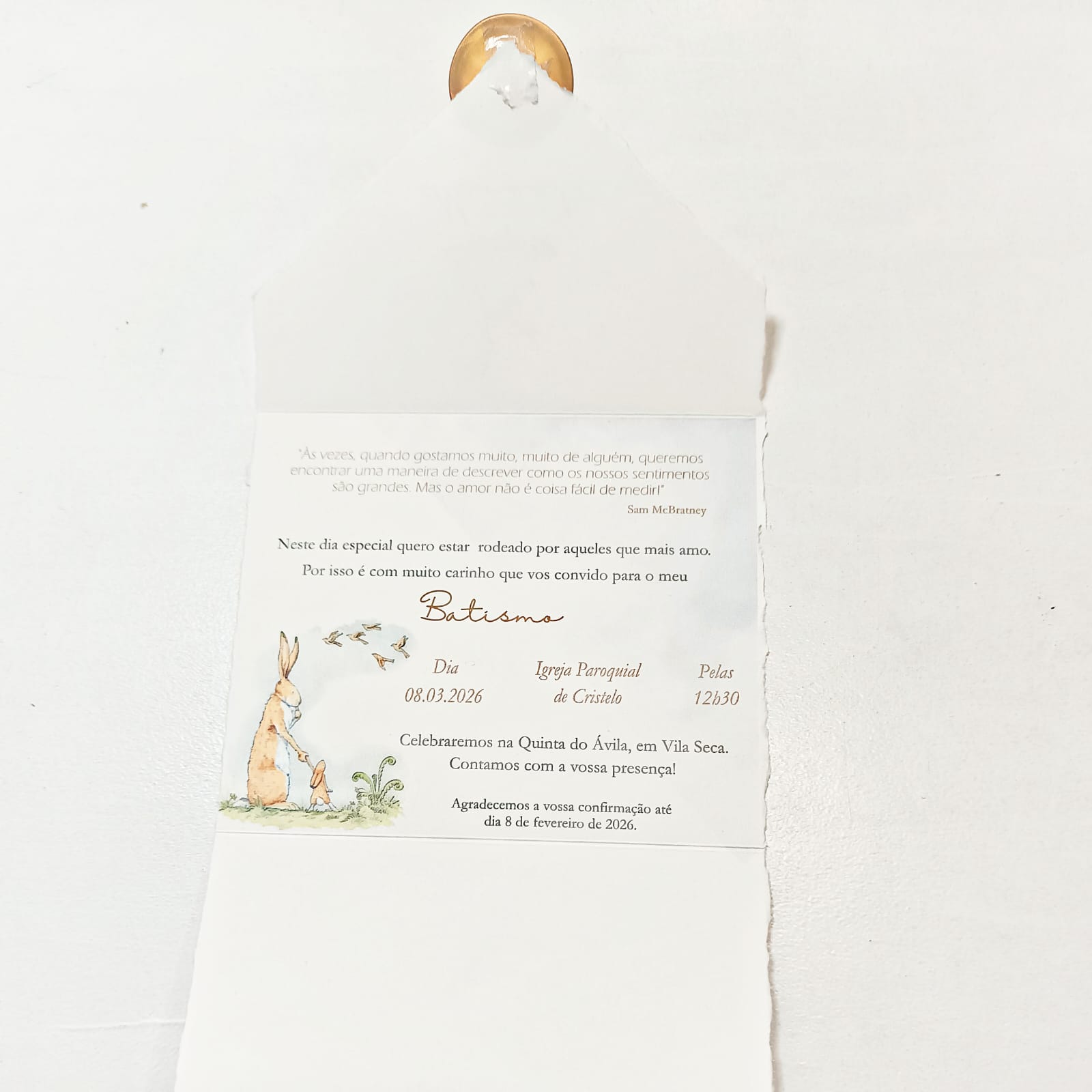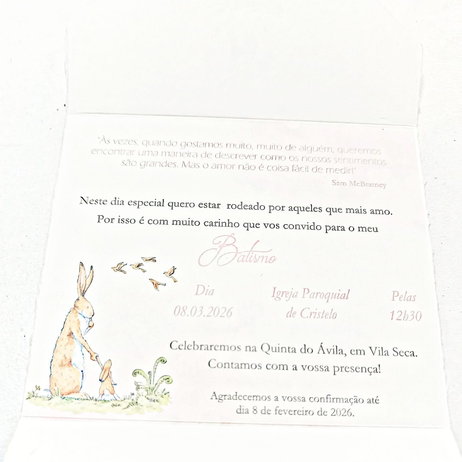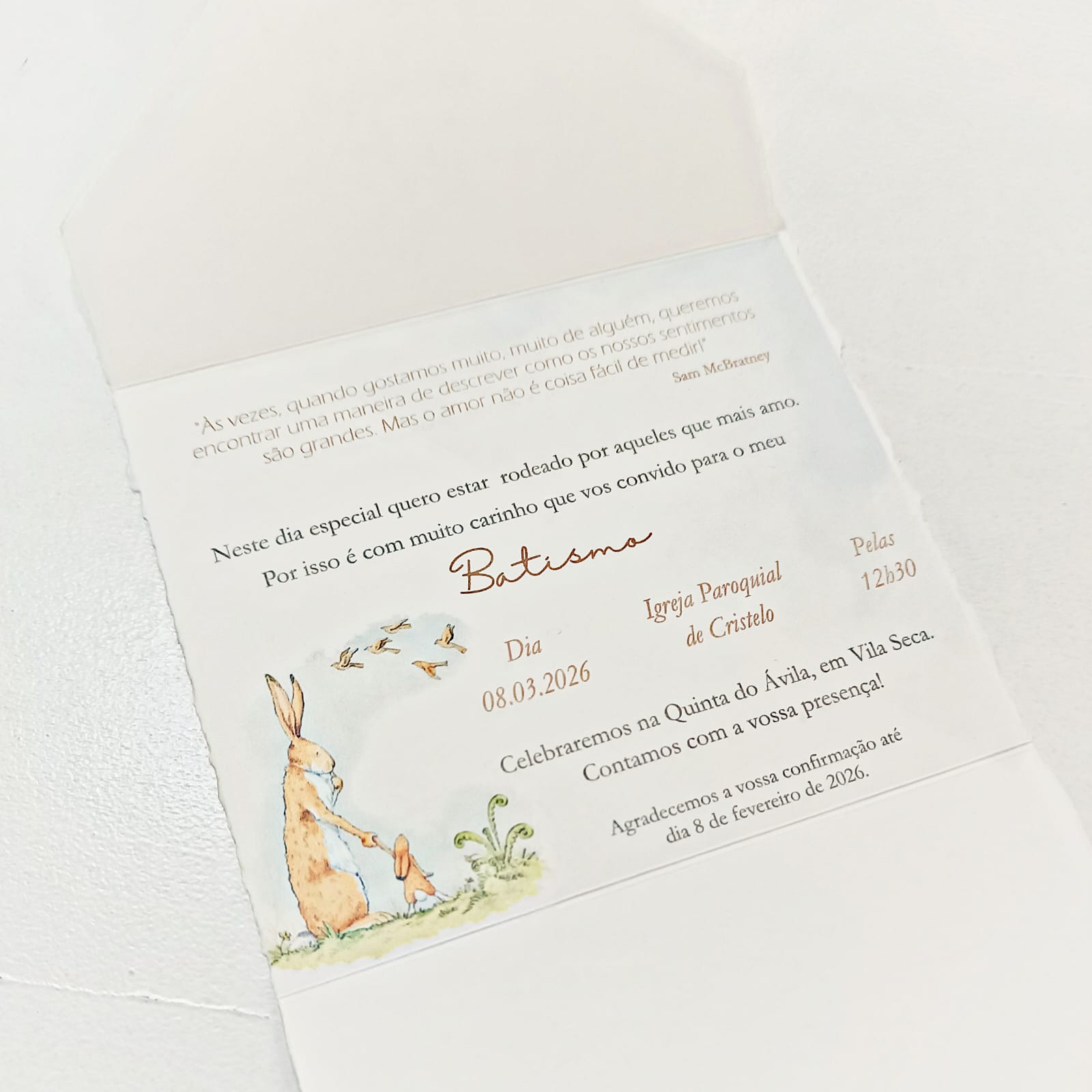 Convite de batismo infantil inspirado no livro “Quanto Eu Gosto de Ti”, com a delicada ilustração da Pequena Lebre, símbolo de amor e ternura.
