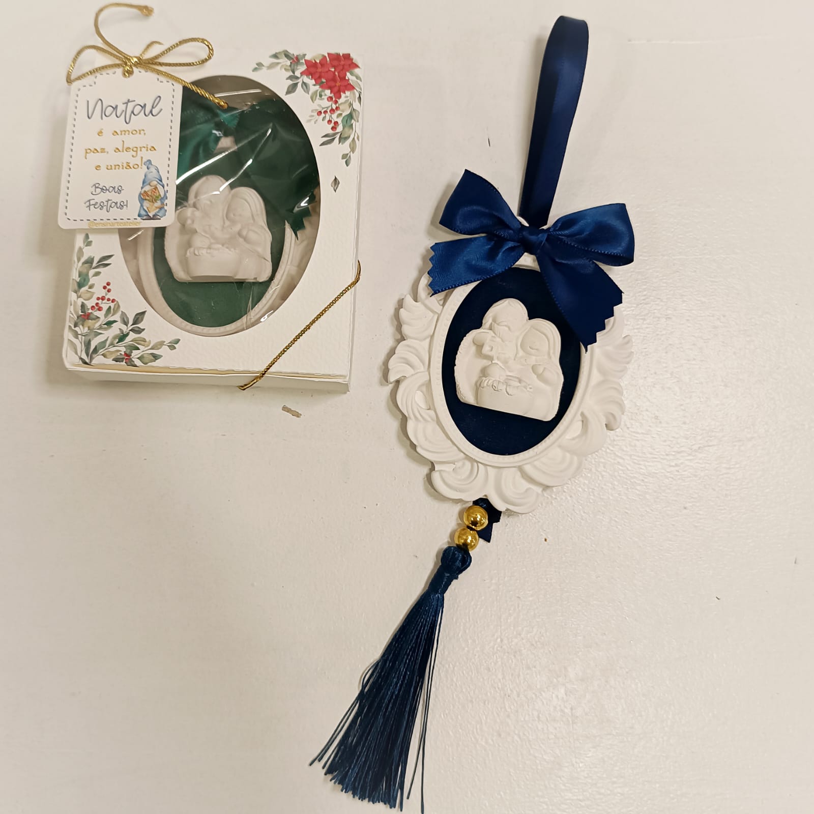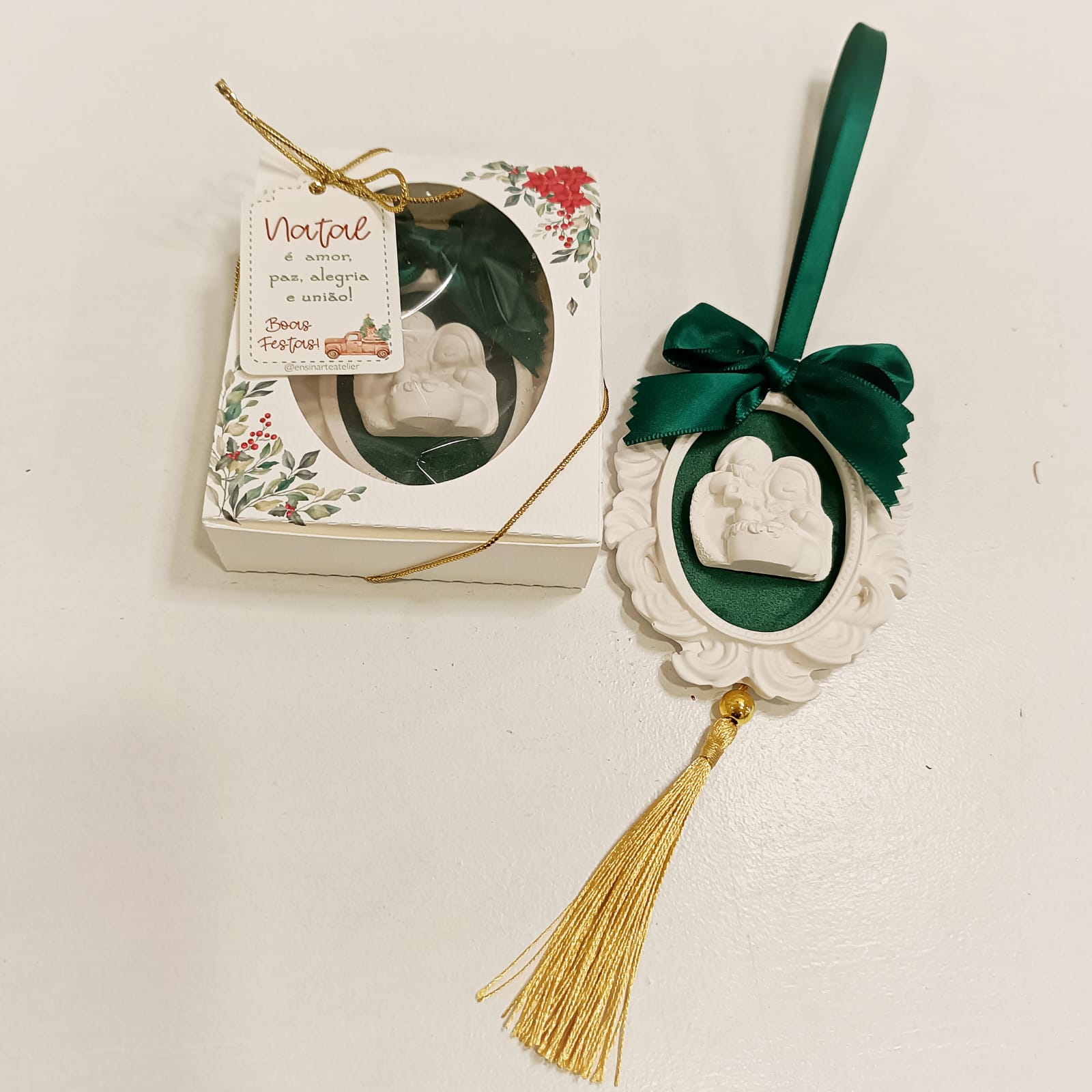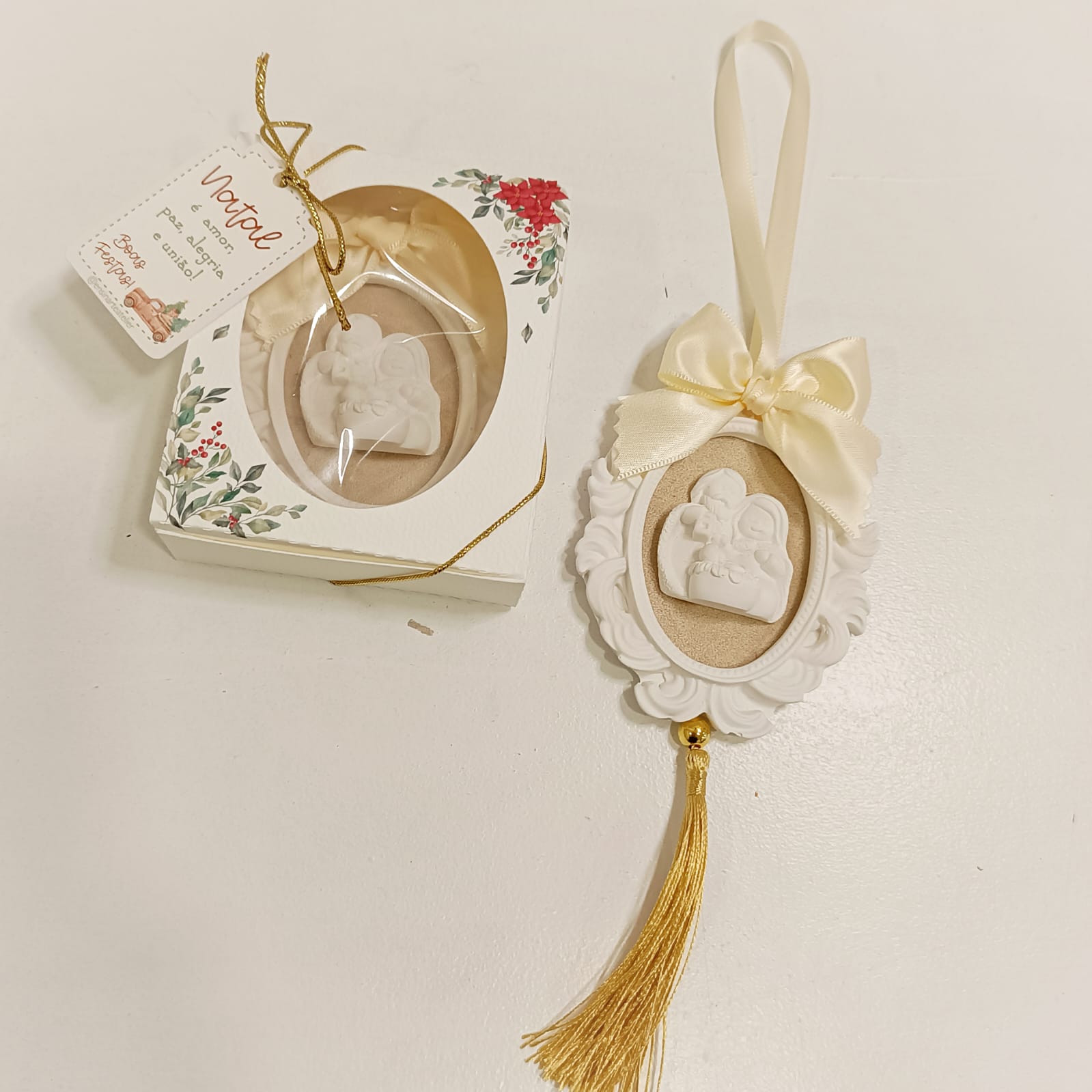 Caixinha delicada com escapulário com presépio, em pó cerâmico perfumado, para pendurar. Um miminho pensado ao pormenor...
