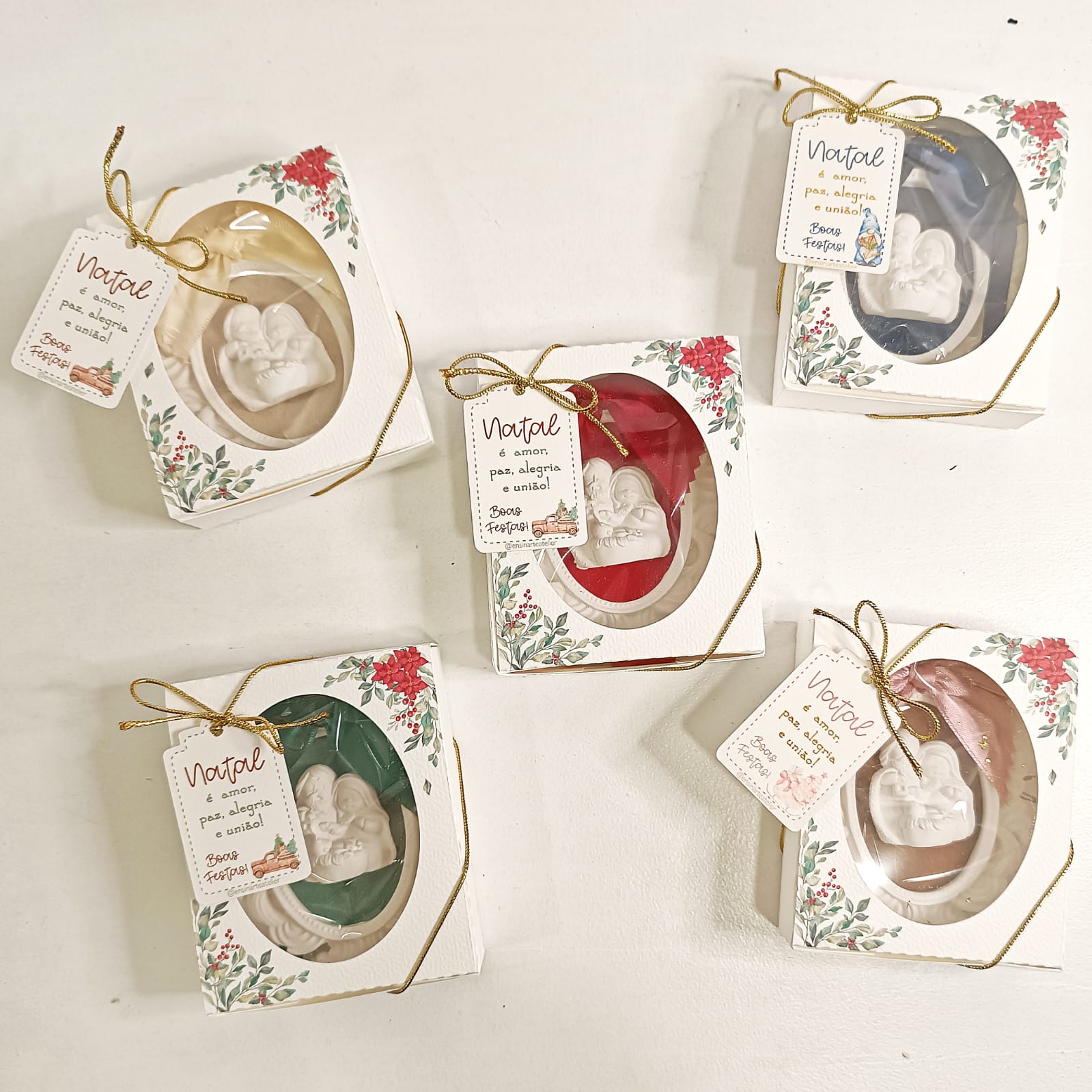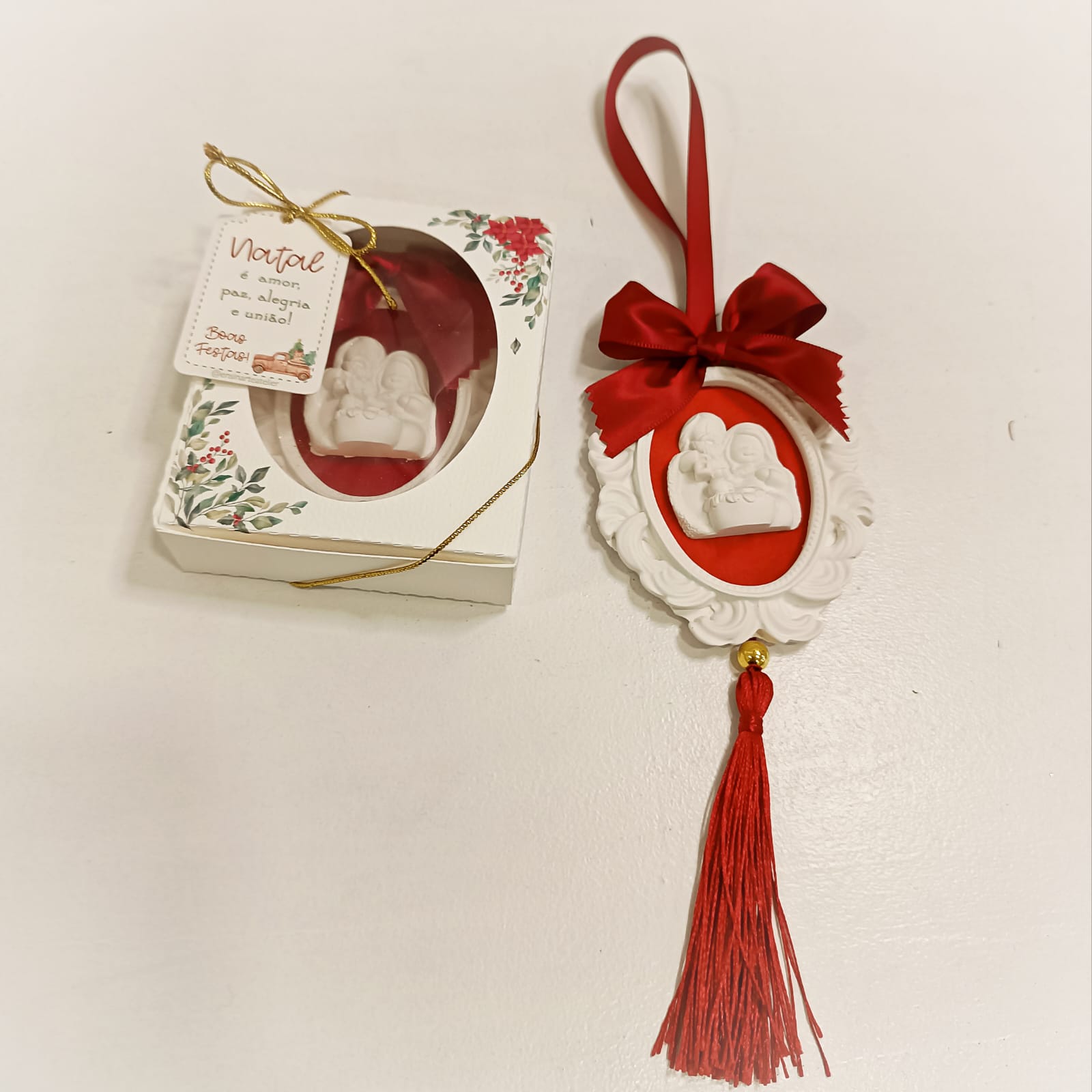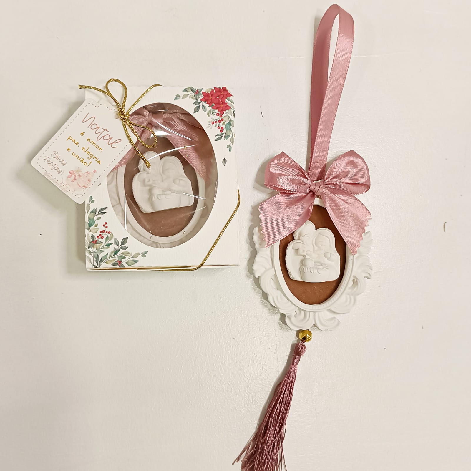 Caixinha delicada com escapulário com presépio, em pó cerâmico perfumado, para pendurar. Um miminho pensado ao pormenor...