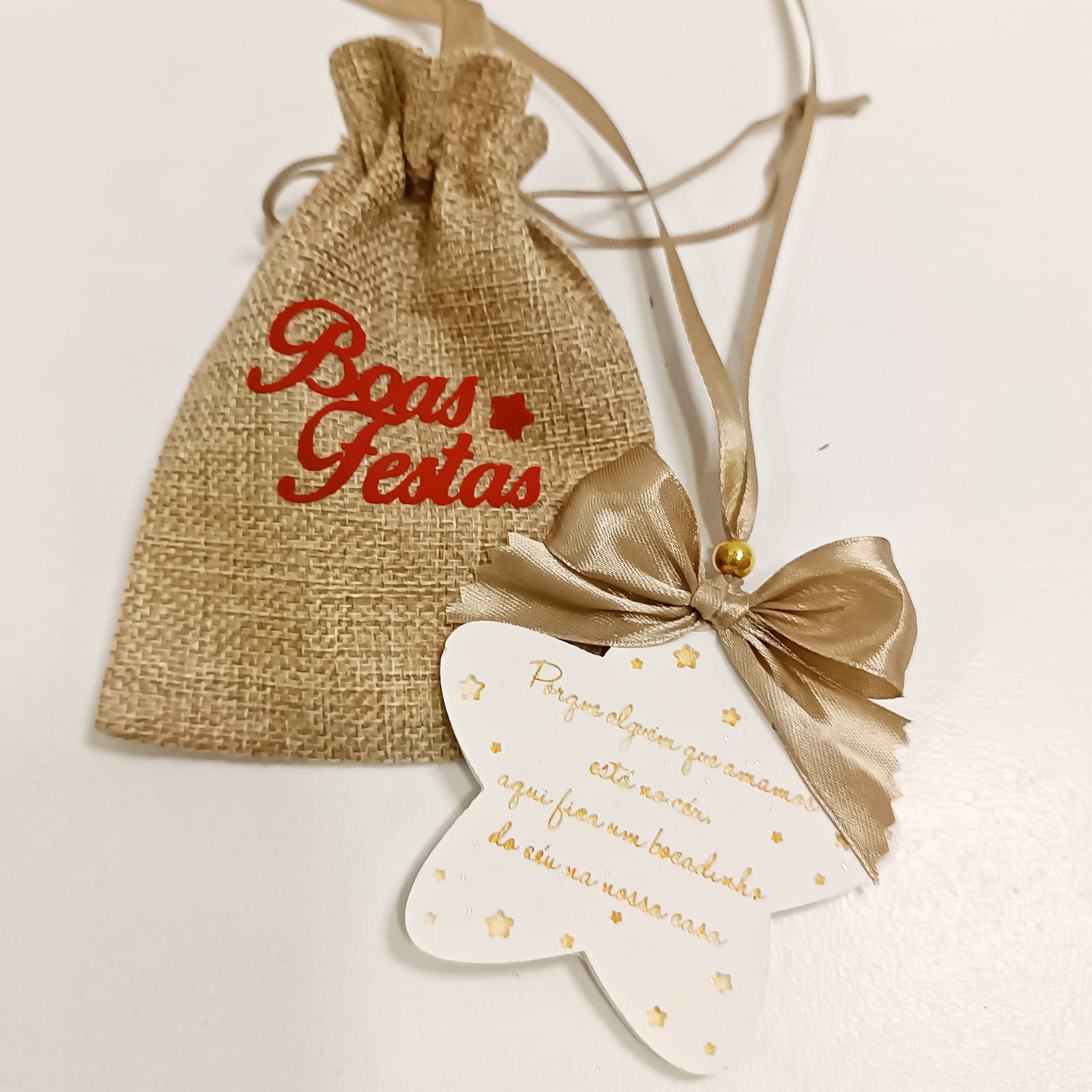 O saquinho de serapilheira realça a peça, deixando-a com um embrulho especial...