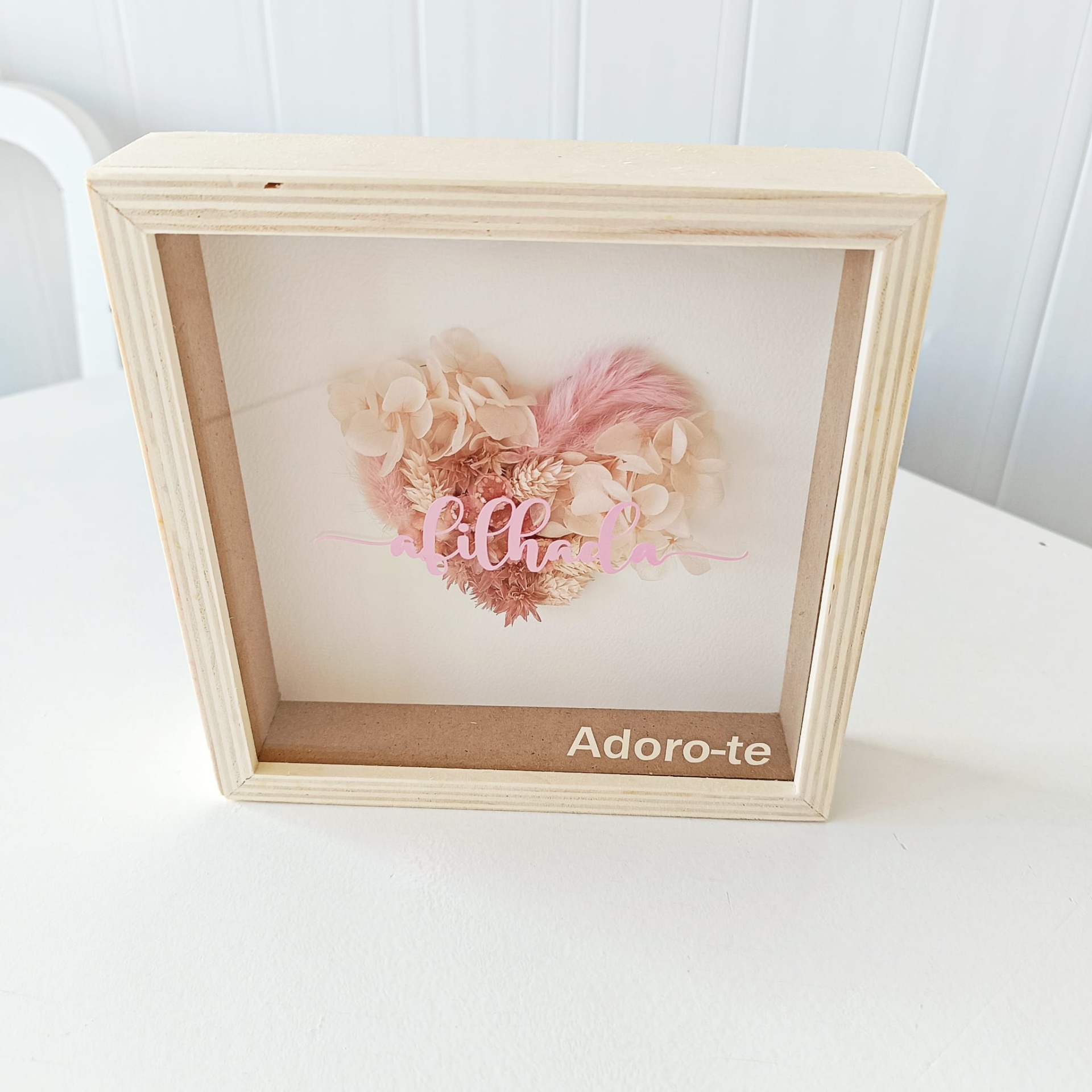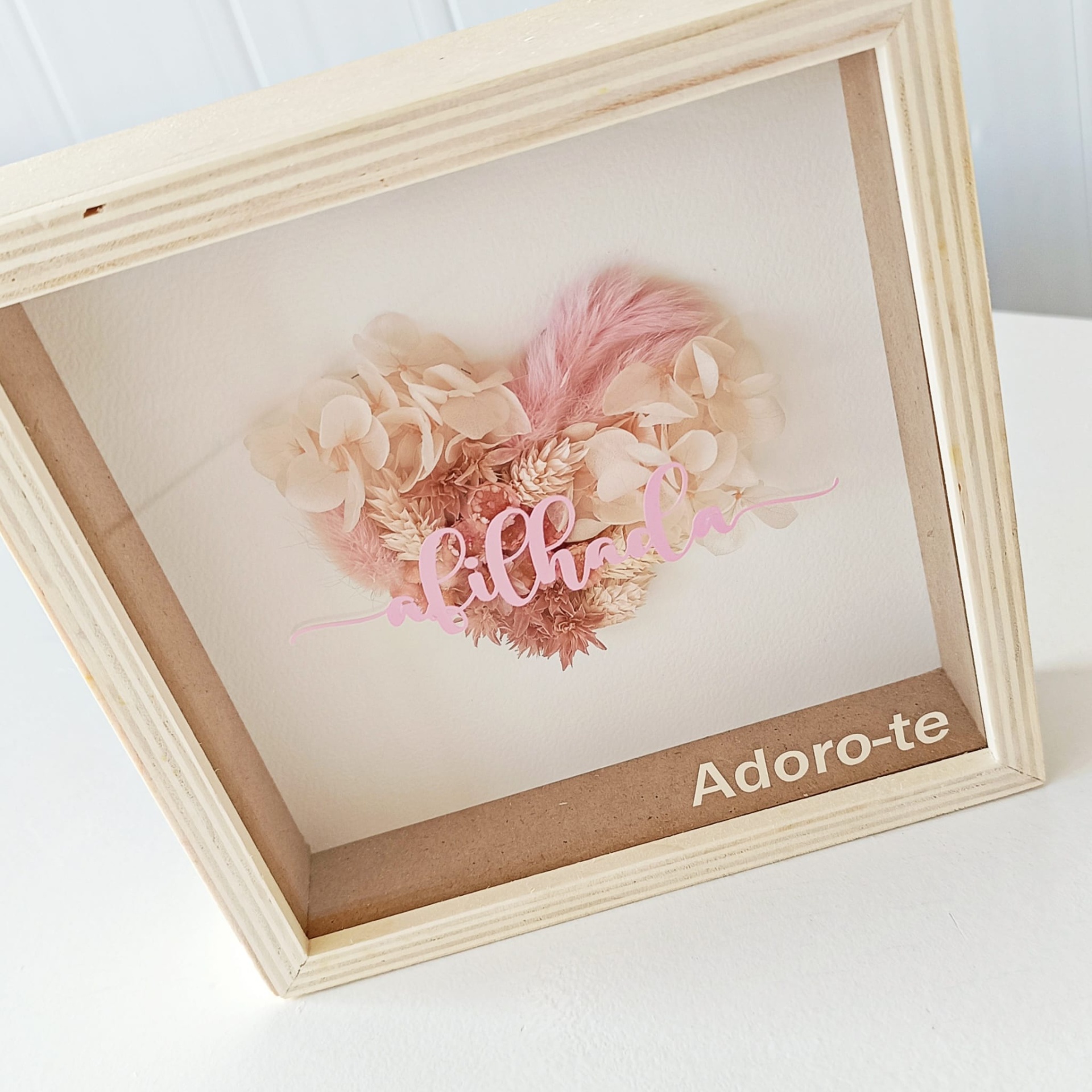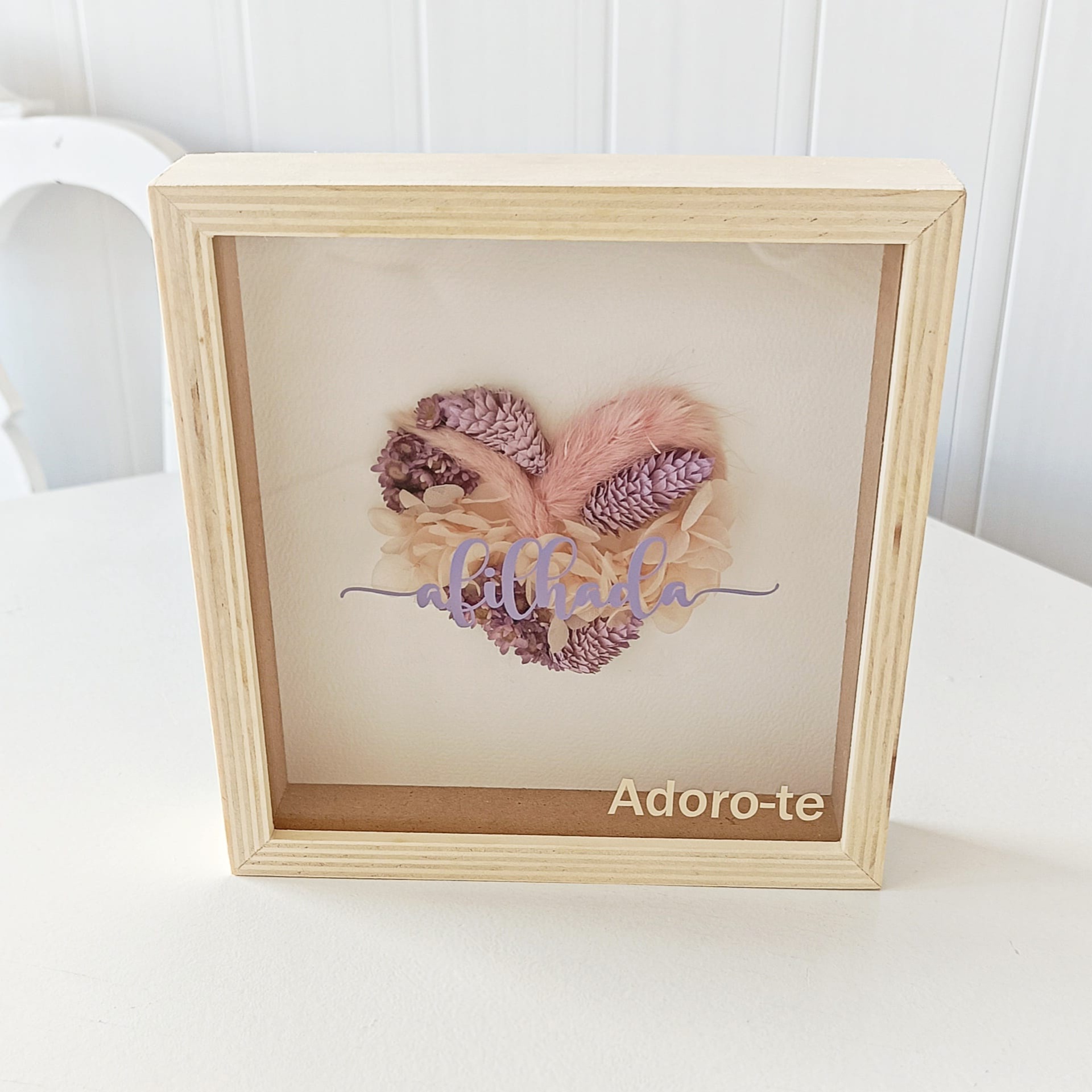 Um coração delicado, criado de forma manual e delicada, em tons suaves e intemporais de rosa e lilás, com a palavra Afilhada e a mensagem “Adoro-te” para tornar o momento ainda mais especial.