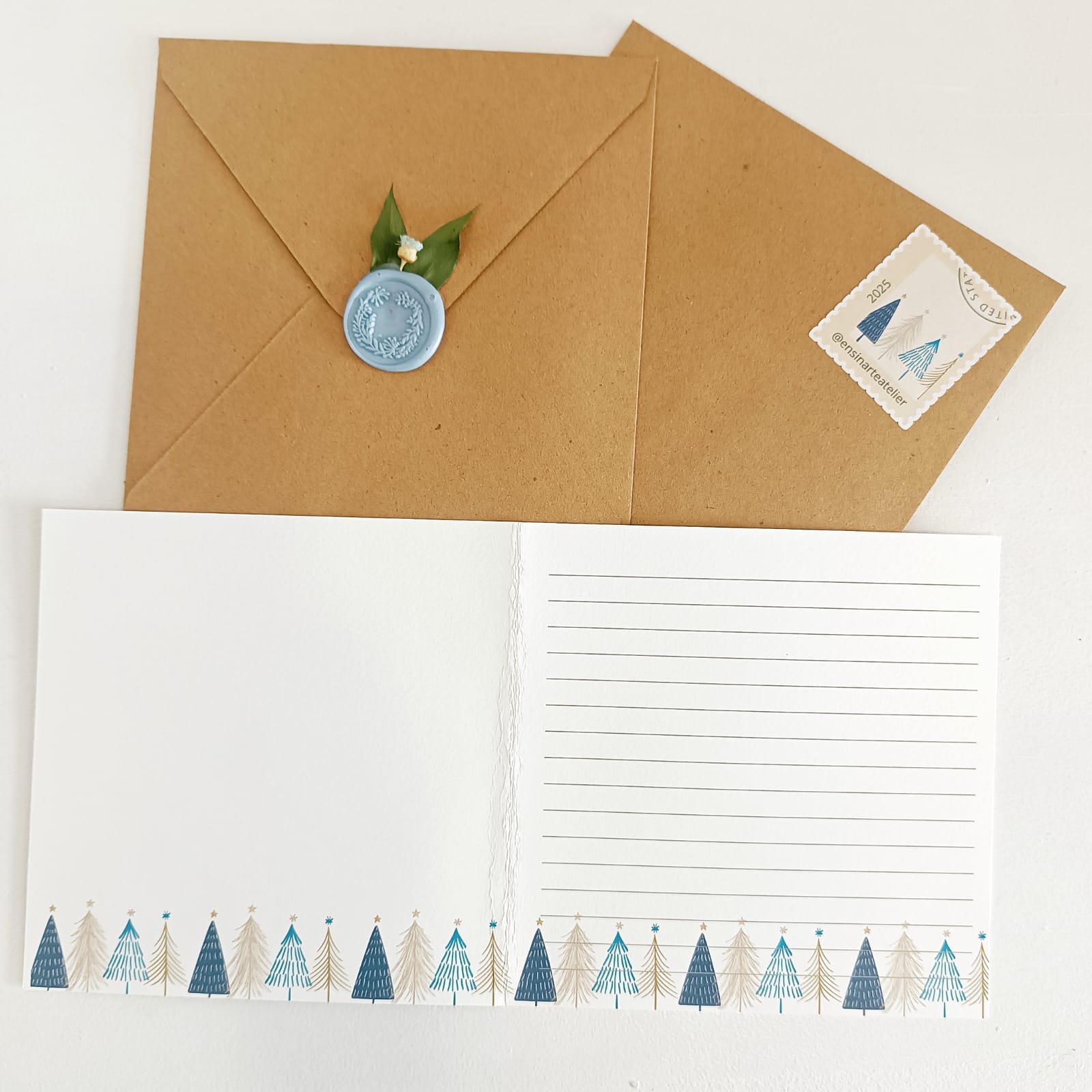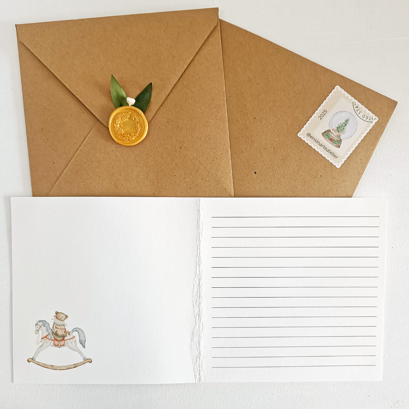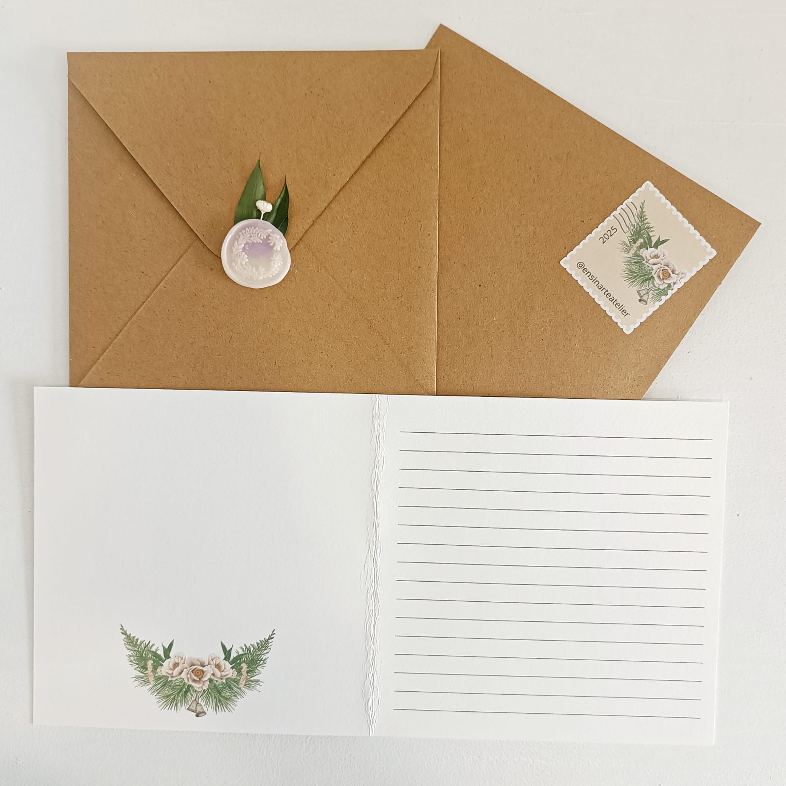 Cada conjunto é composto por: postal (14x14cm) e envelope Kraft (15x15cm) com selo natalício e lacre para fechar!