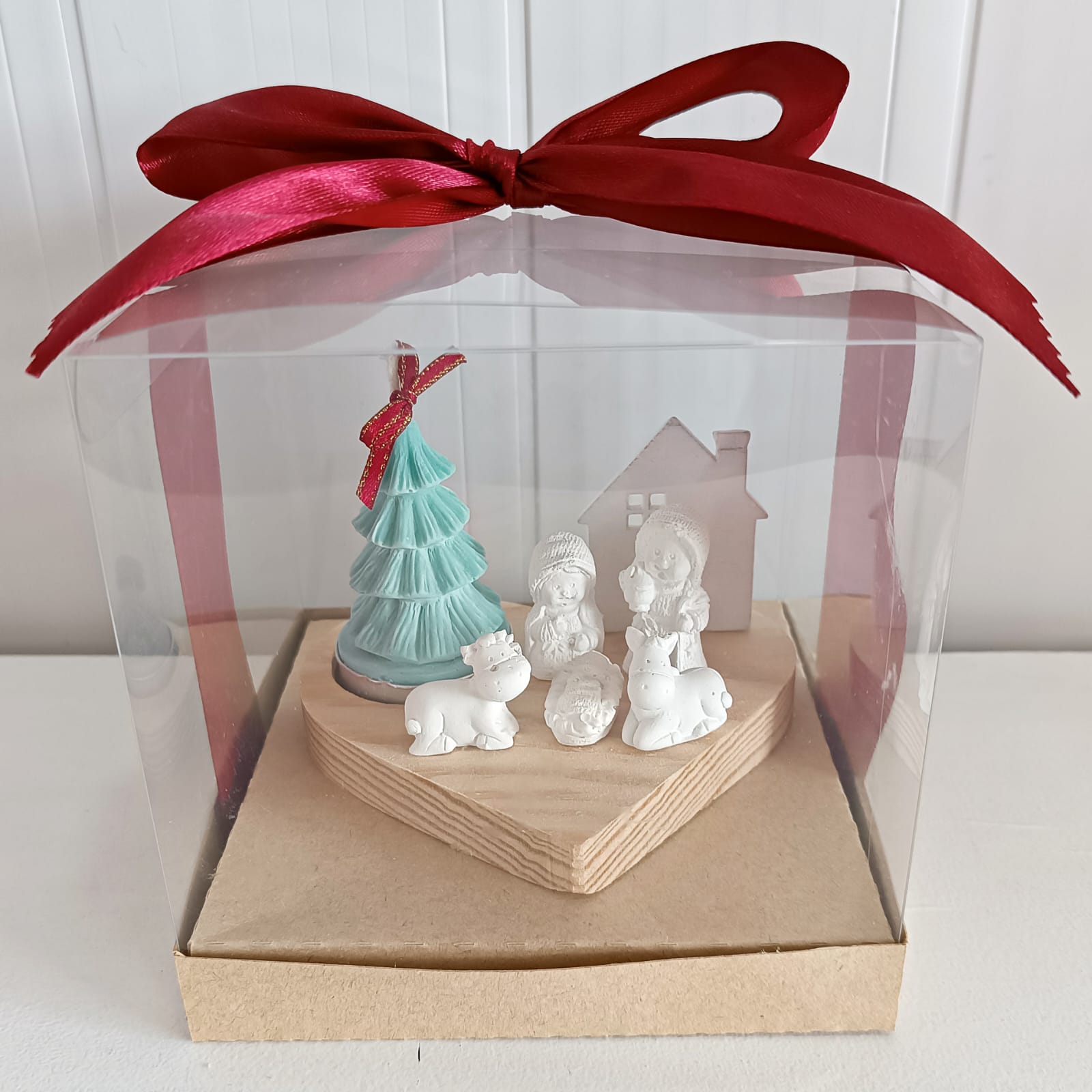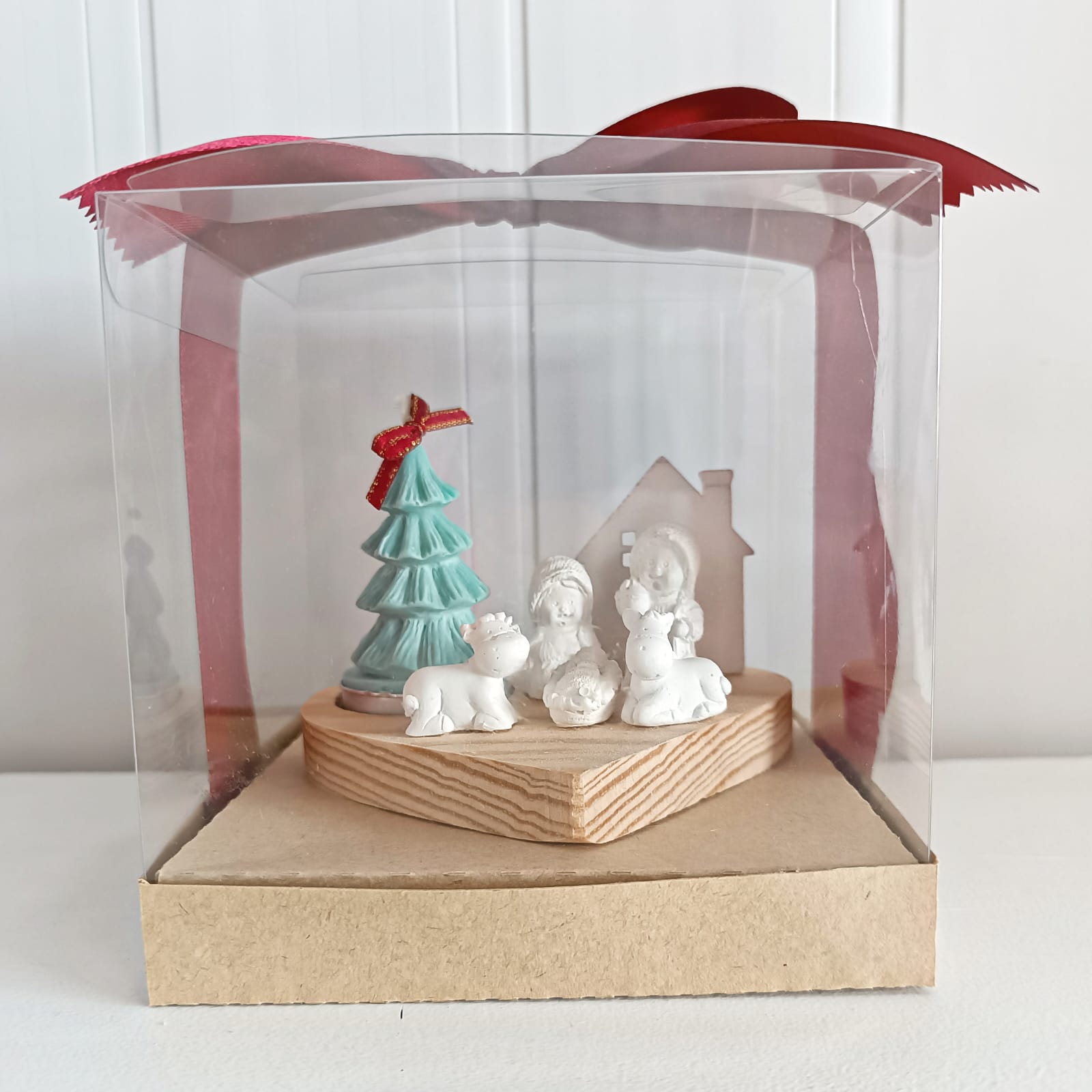 Caixinha com base de madeira formato coração, pinheiro em cera de soja perfumada com essência maçã e canela, e mini presépio em pó cerâmico perfumado.