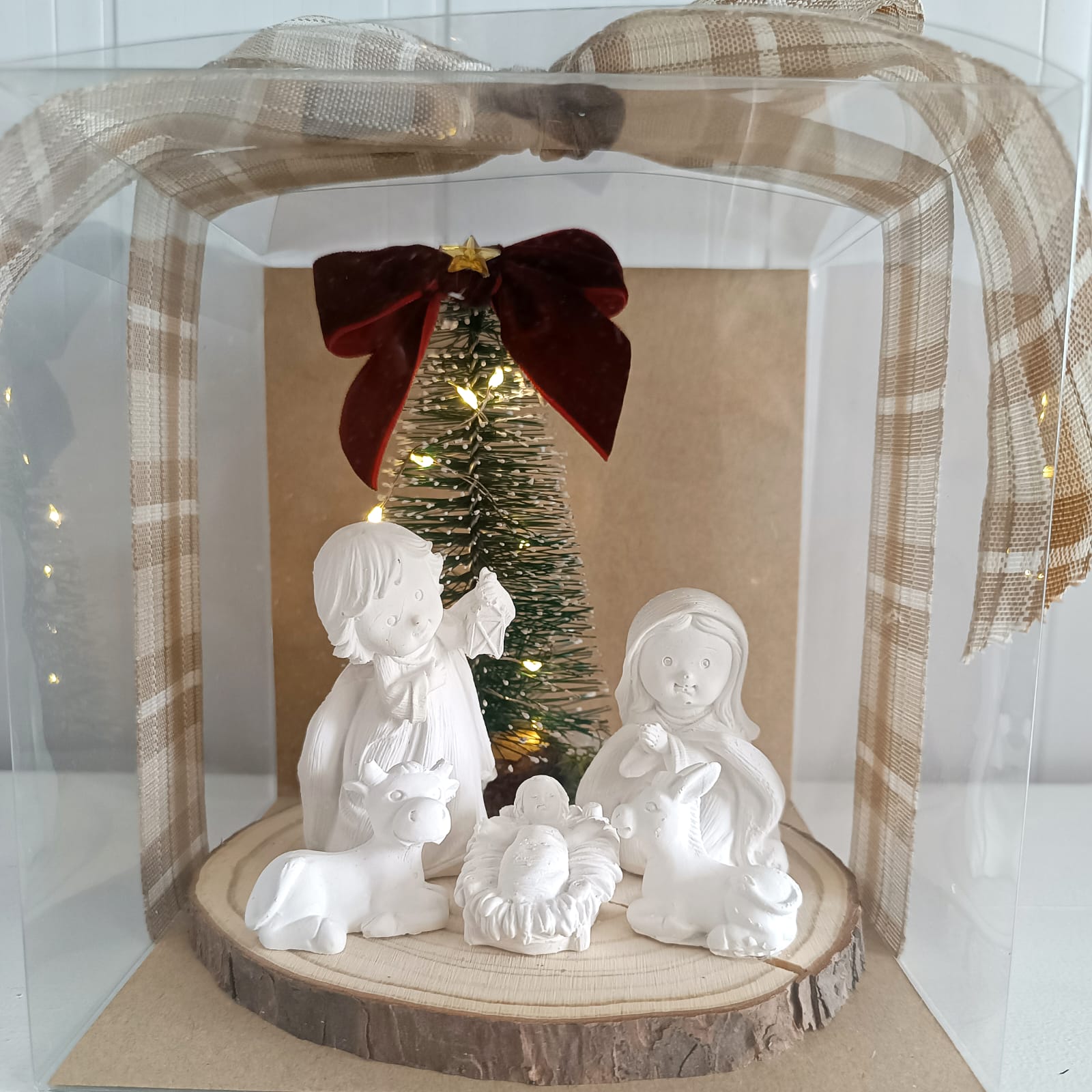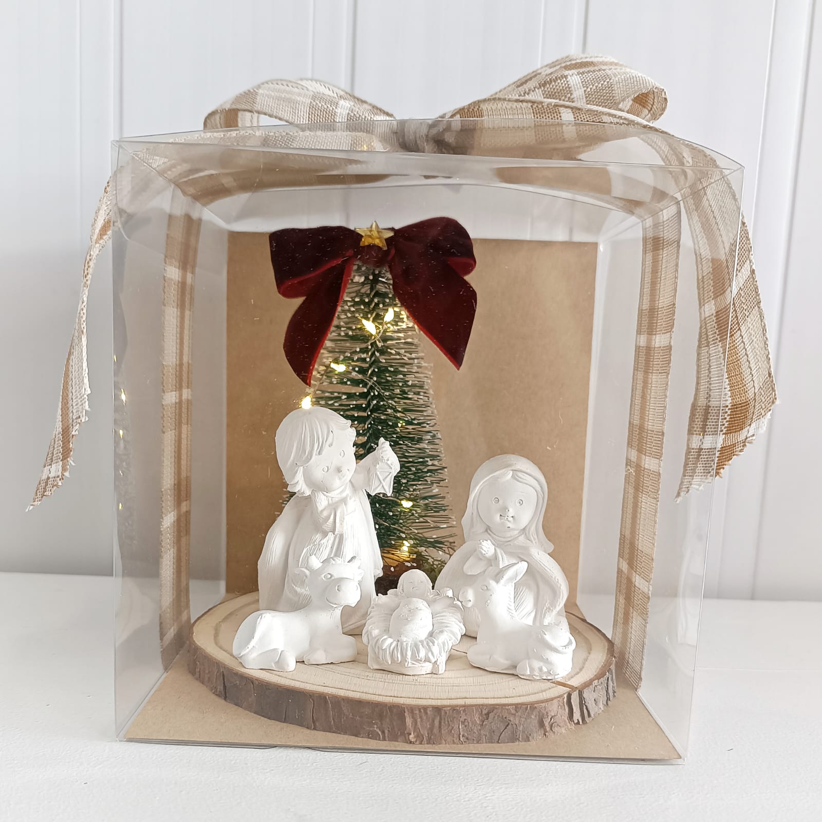 Numa embalagem delicada e cuidadosamente pensada para este encantador Presépio infantil em pó cerâmico perfumado e pinheirinho com leds.