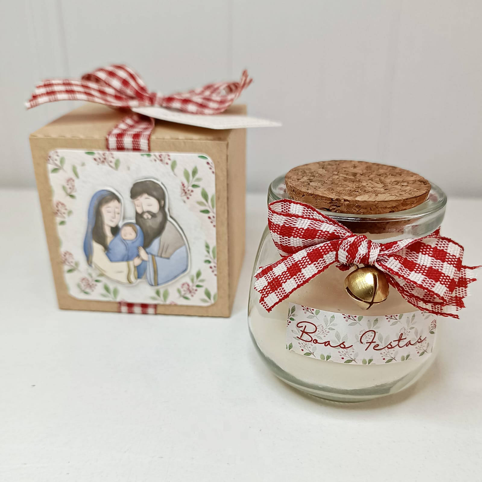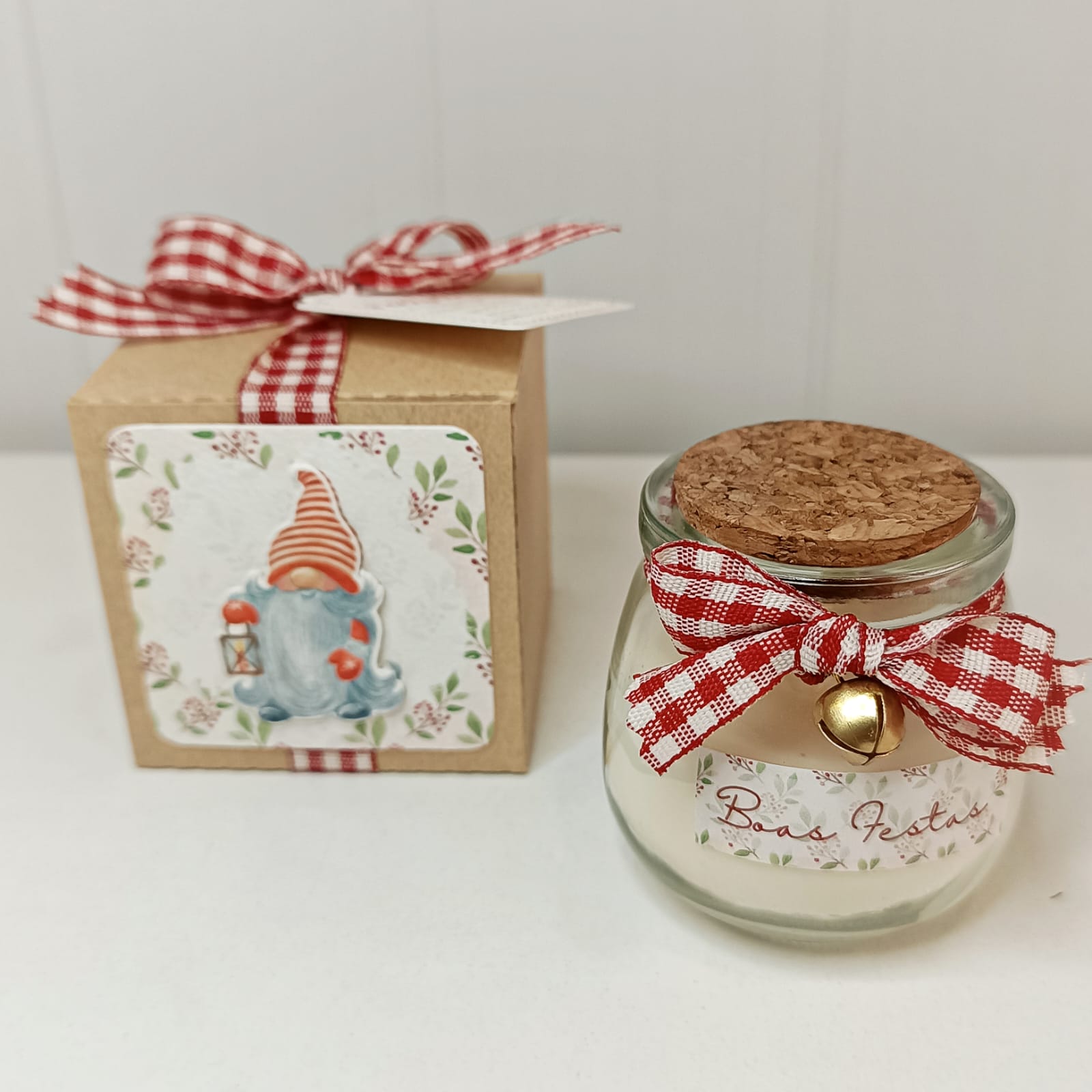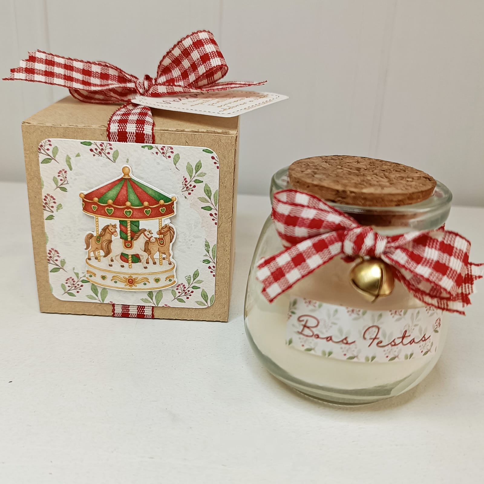 Caixinha com vela de natal, feita com cera de soja e aromatizada com essência maçã e canela.