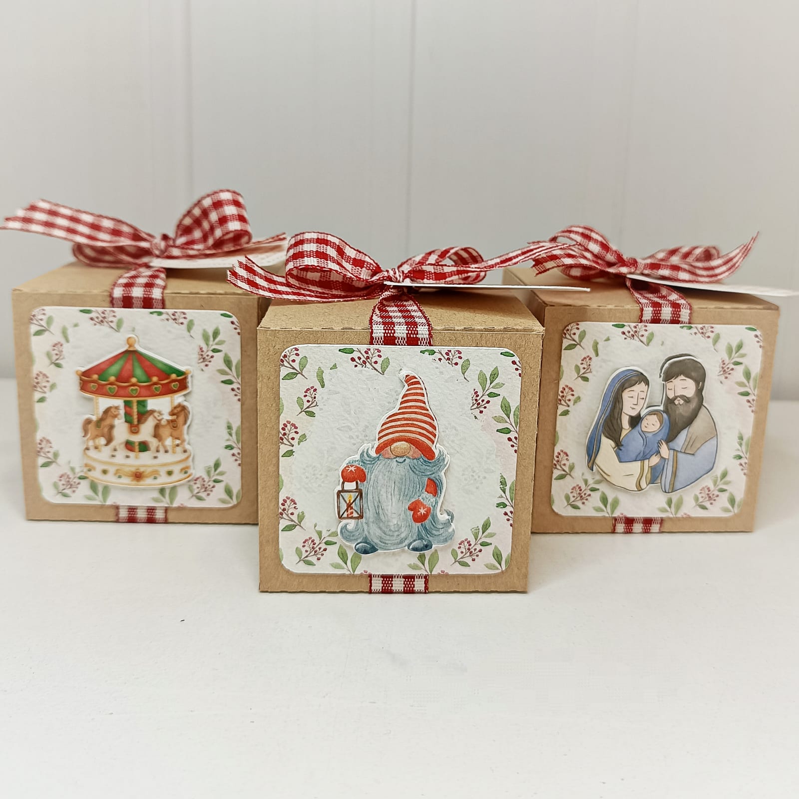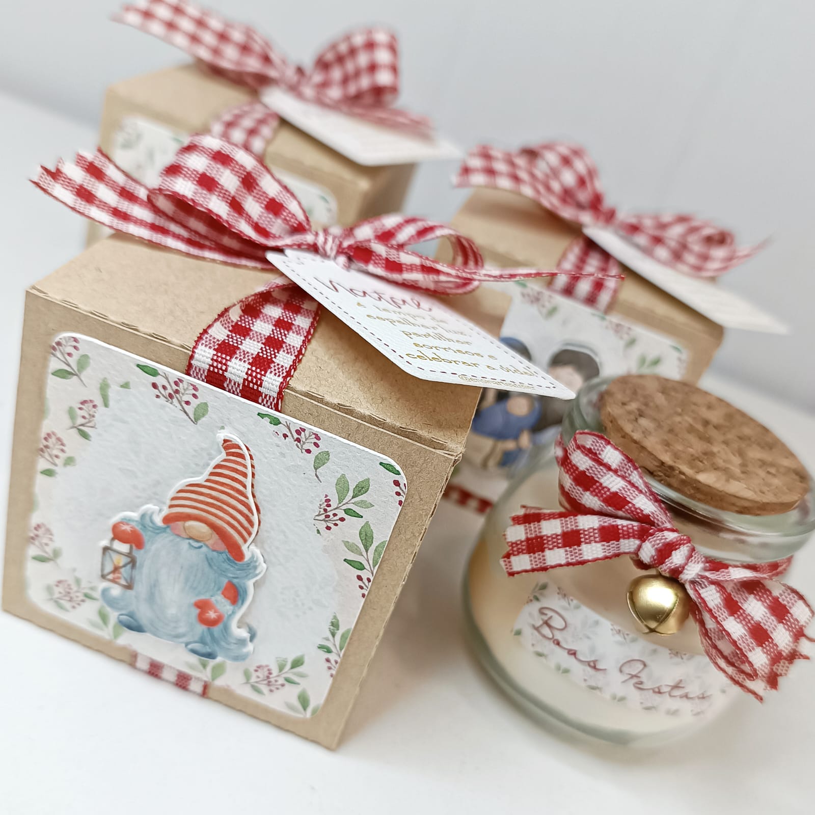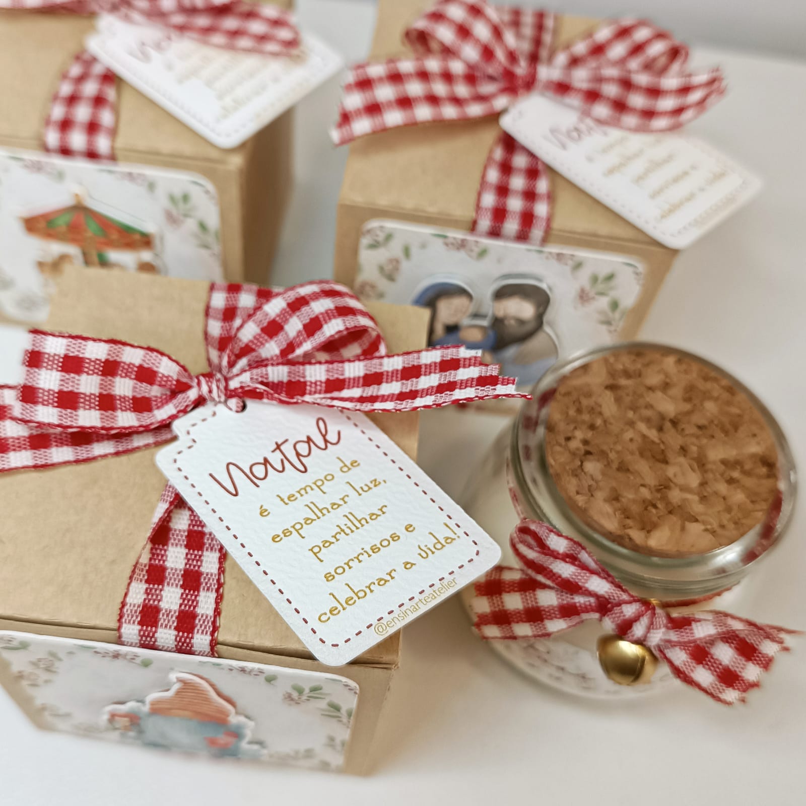 Caixinha com vela de natal, feita com cera de soja e aromatizada com essência maçã e canela.